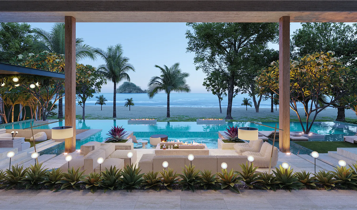A: Instead of competing with the environment, we design to frame it. At Costa Palma, for example, the yard was designed with a series of distinct areas leading all the way to the beach, with features like a reflection pool, covered patio, and infinity-edge transitions that echo the coastline.