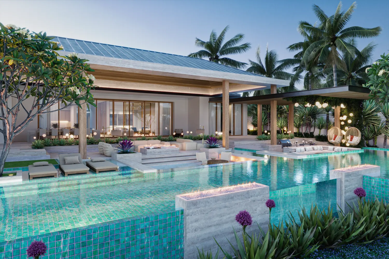 A: Each area is designed to feel thoughtful and complete—whether it’s a sunken seating area mixed with fire and water, floating daybeds that create a resort-style feel, or outdoor dining and oversized lounges that rival any interior space.