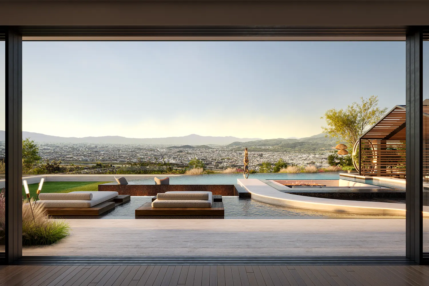 A boardwalk draws your eye through the outdoor space, while a gently curving pool adds an organic touch to the modern lines. A sunken seating area in the pool combines fire and water for a dramatic effect, while oversized floating daybeds create the resort-style outdoor living experience that makes this space feel transportive.
