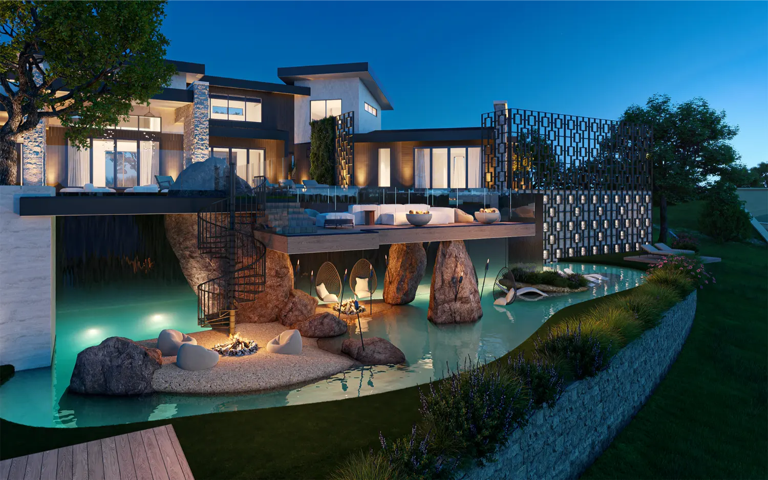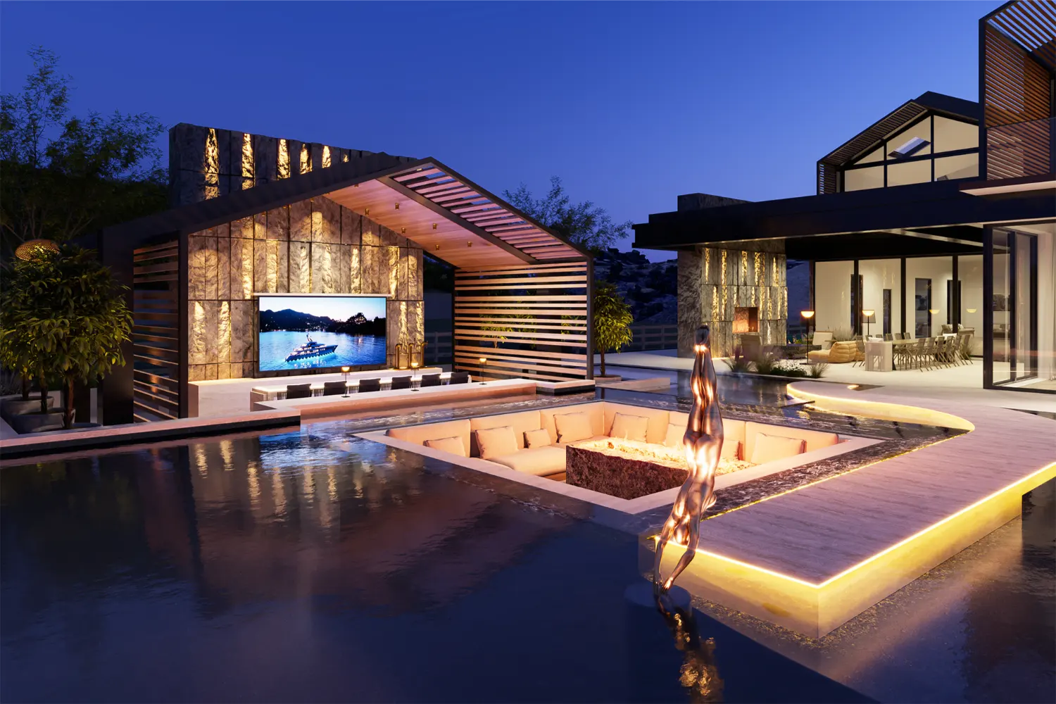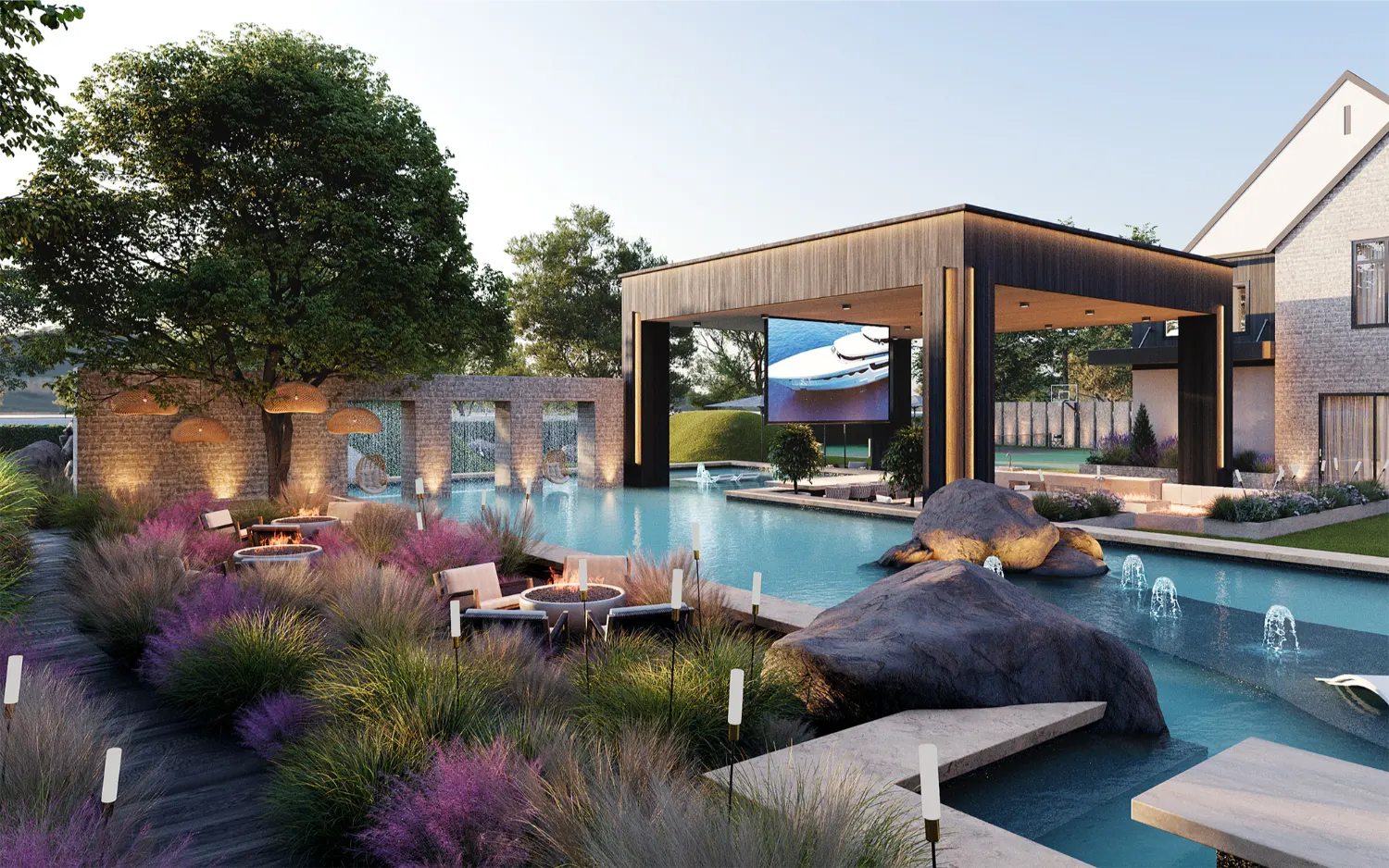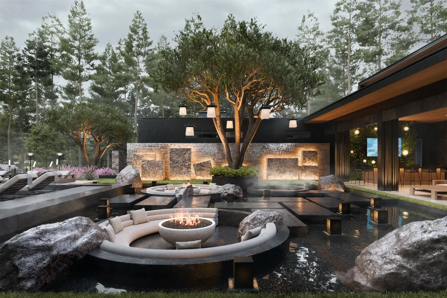 — Fire integrated with water. Floating flames and pool-framing fire features create that fire-and-water contrast that makes the whole space feel elevated at night.