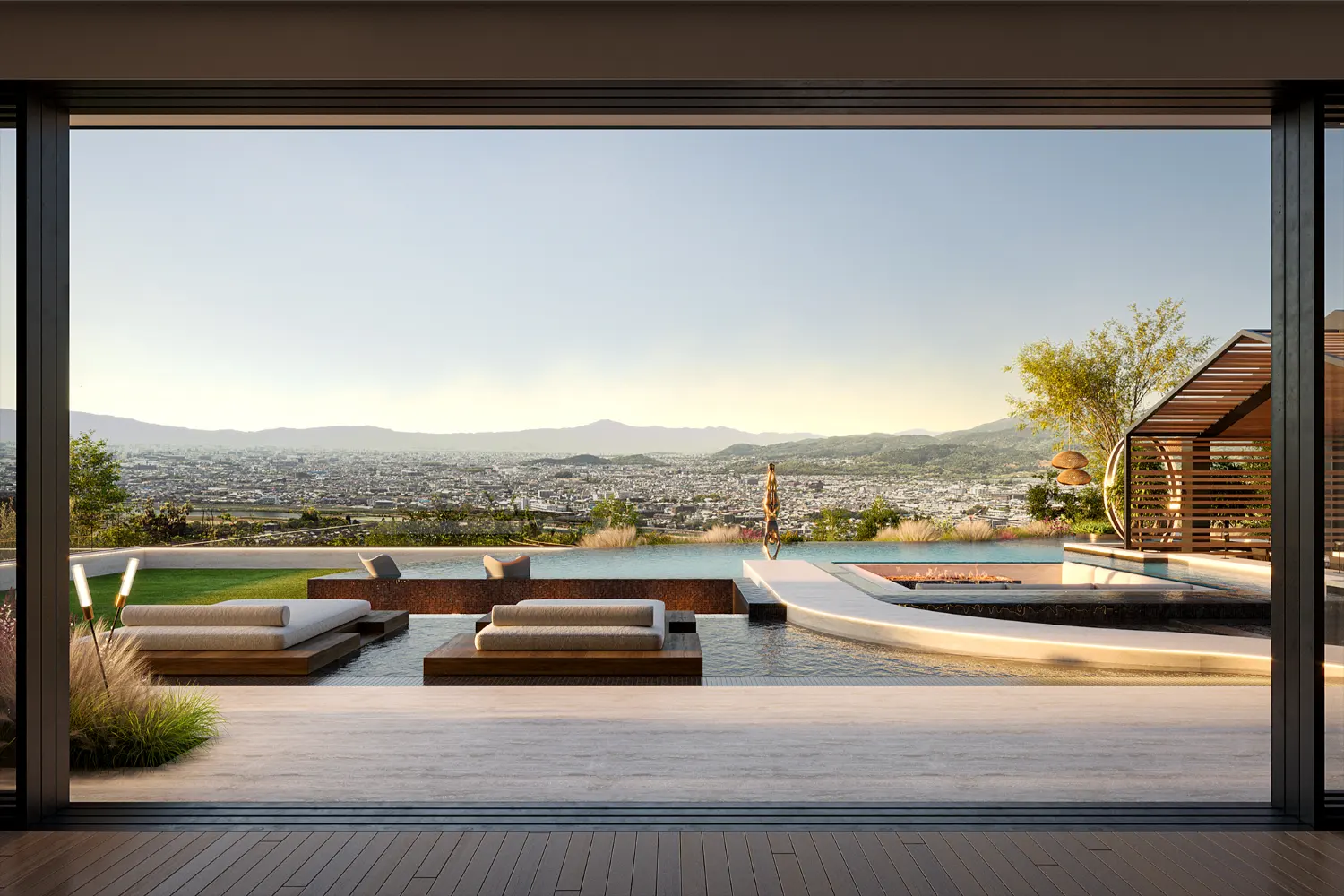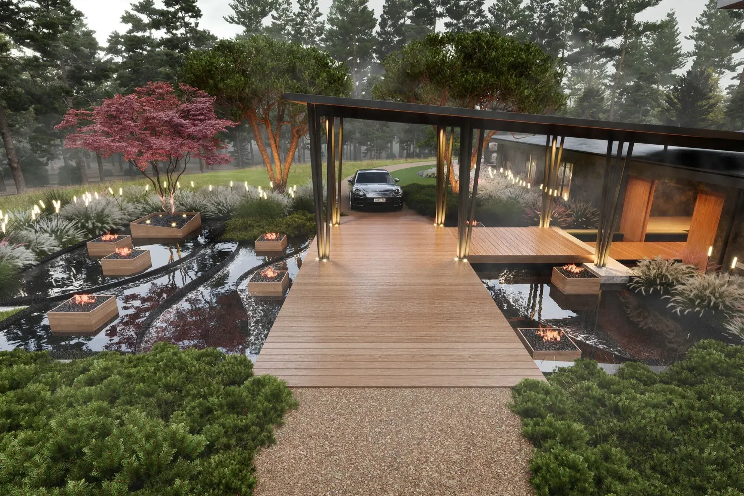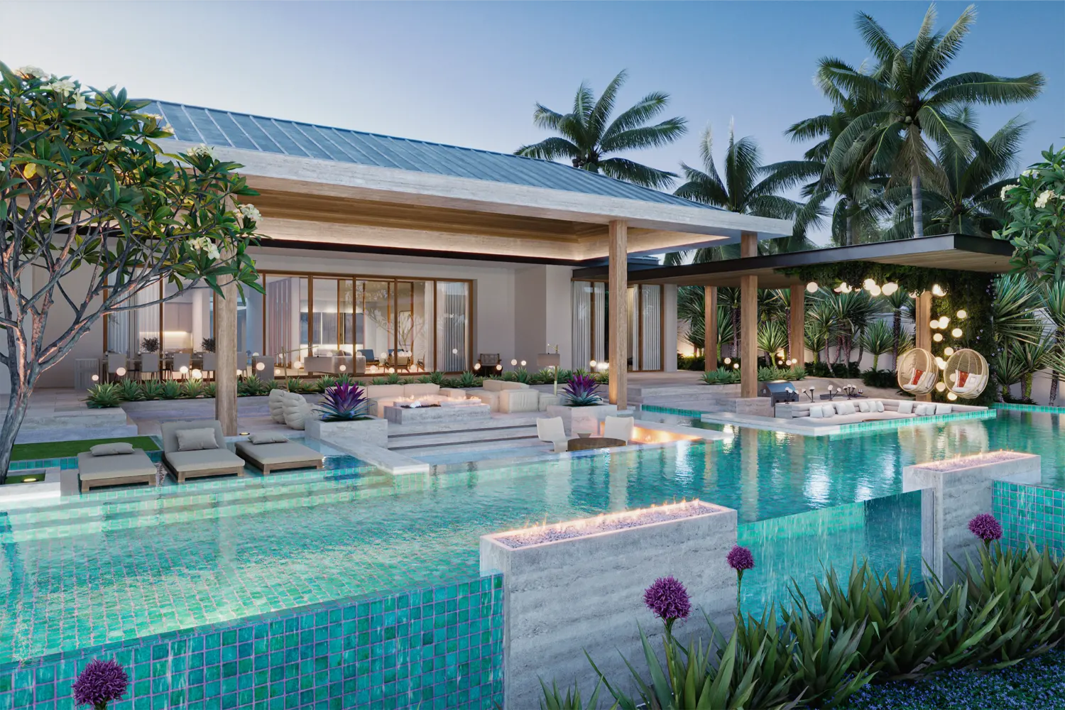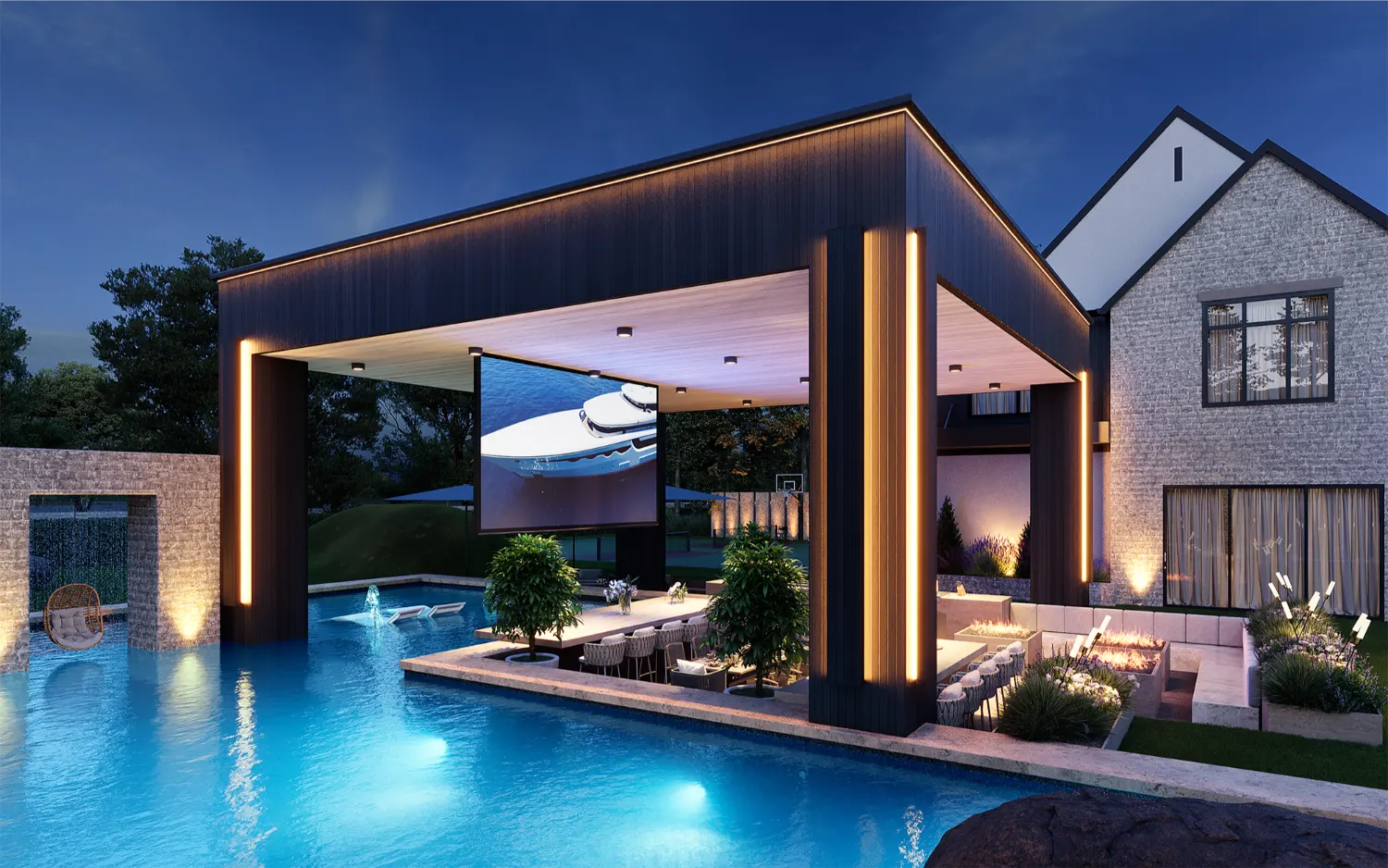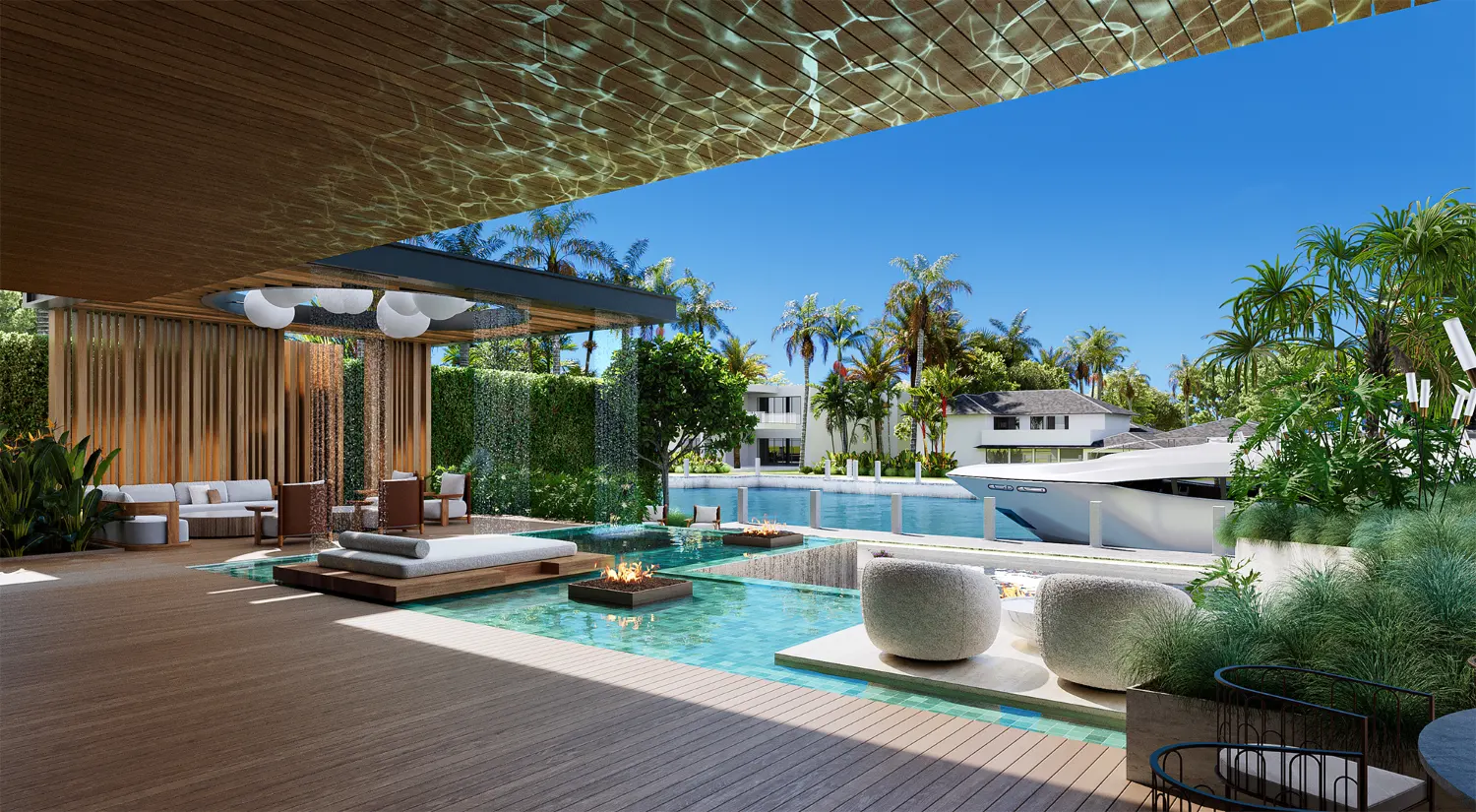 — Fire integrated with water. Floating flames and pool-framing fire features create that fire-and-water contrast that makes the whole space feel elevated at night.