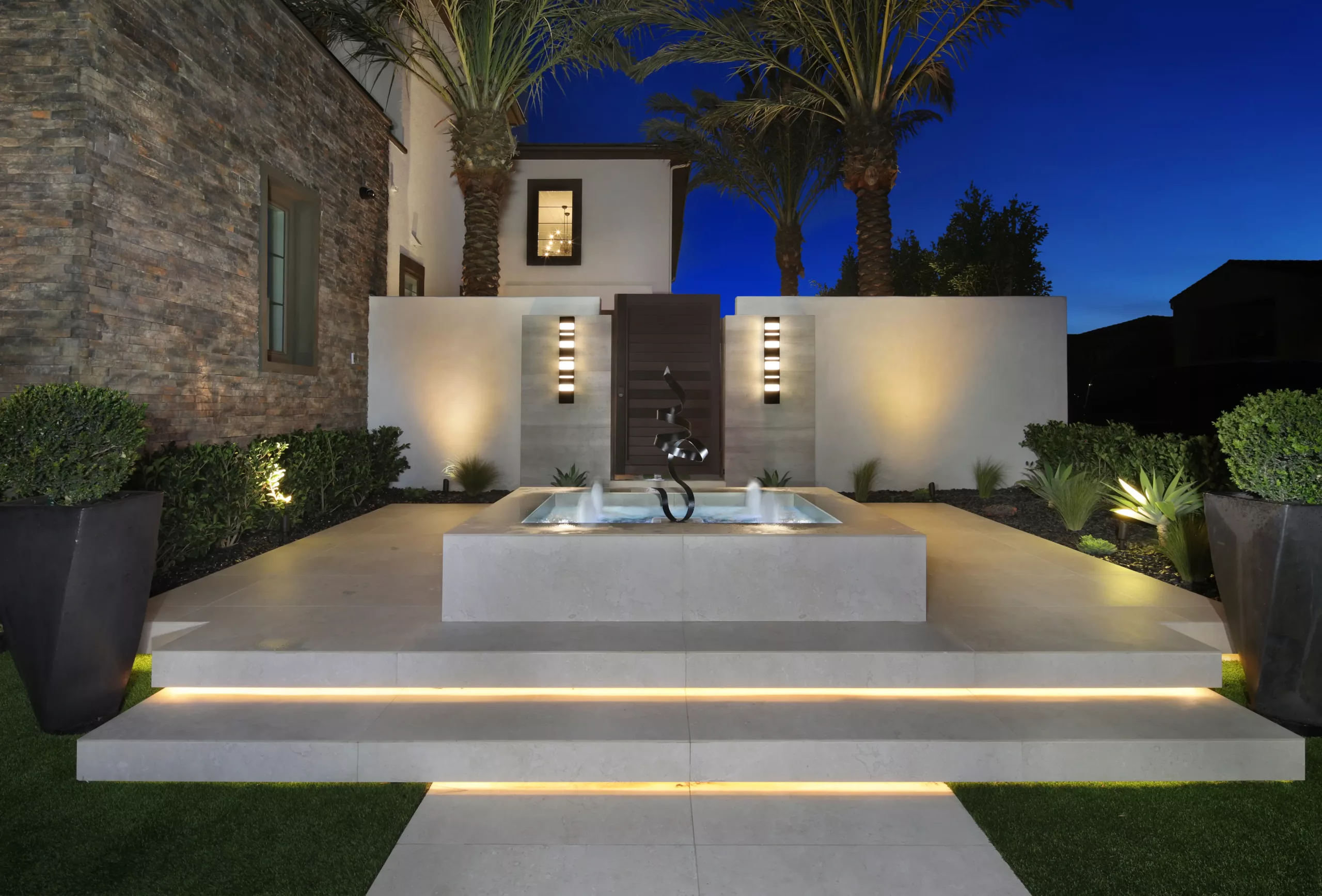 Once inside the gate, the courtyard reveals a truly unique water feature. This infinity-style fountain incorporates custom lighting that appears almost sculptural at night, transforming the feature into a piece of functional art.