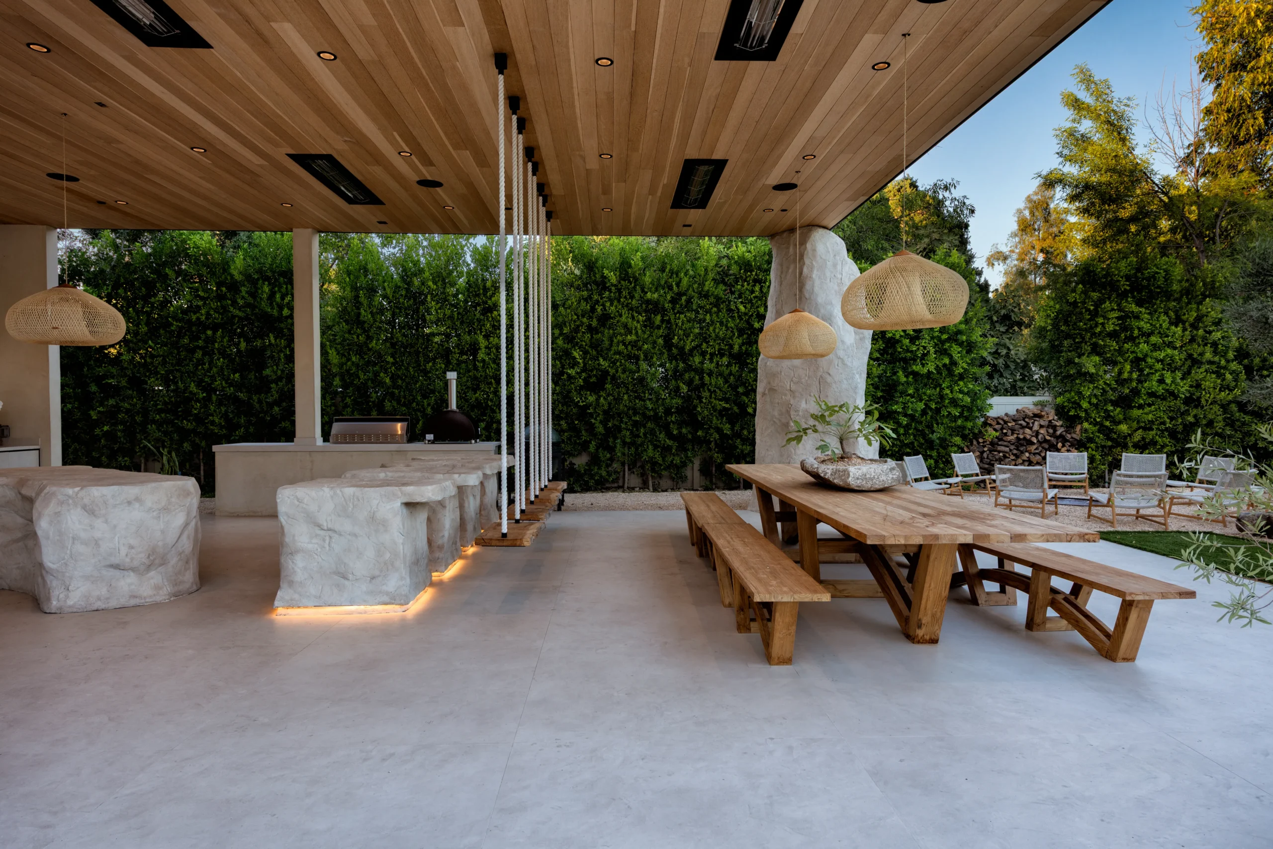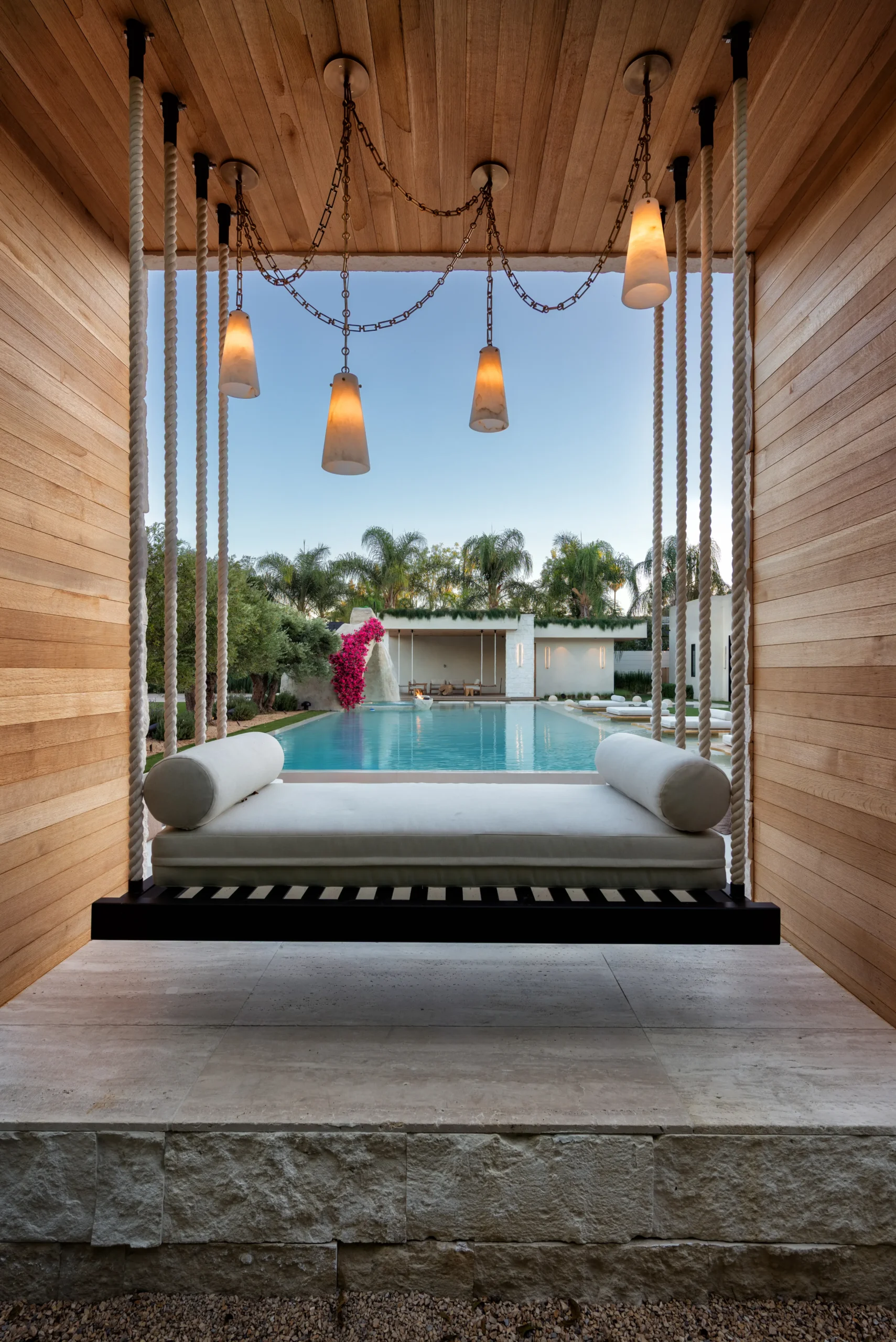 Most of the time, we add bar stools — but because this is an organic, nature-inspired space, we added large swings instead. It’s something you don’t typically see in a backyard — you’d expect to see this type of design feature at a resort in Tulum or some other tropical boutique hotel location. But in this space, it really works to add a playful touch to the yard.