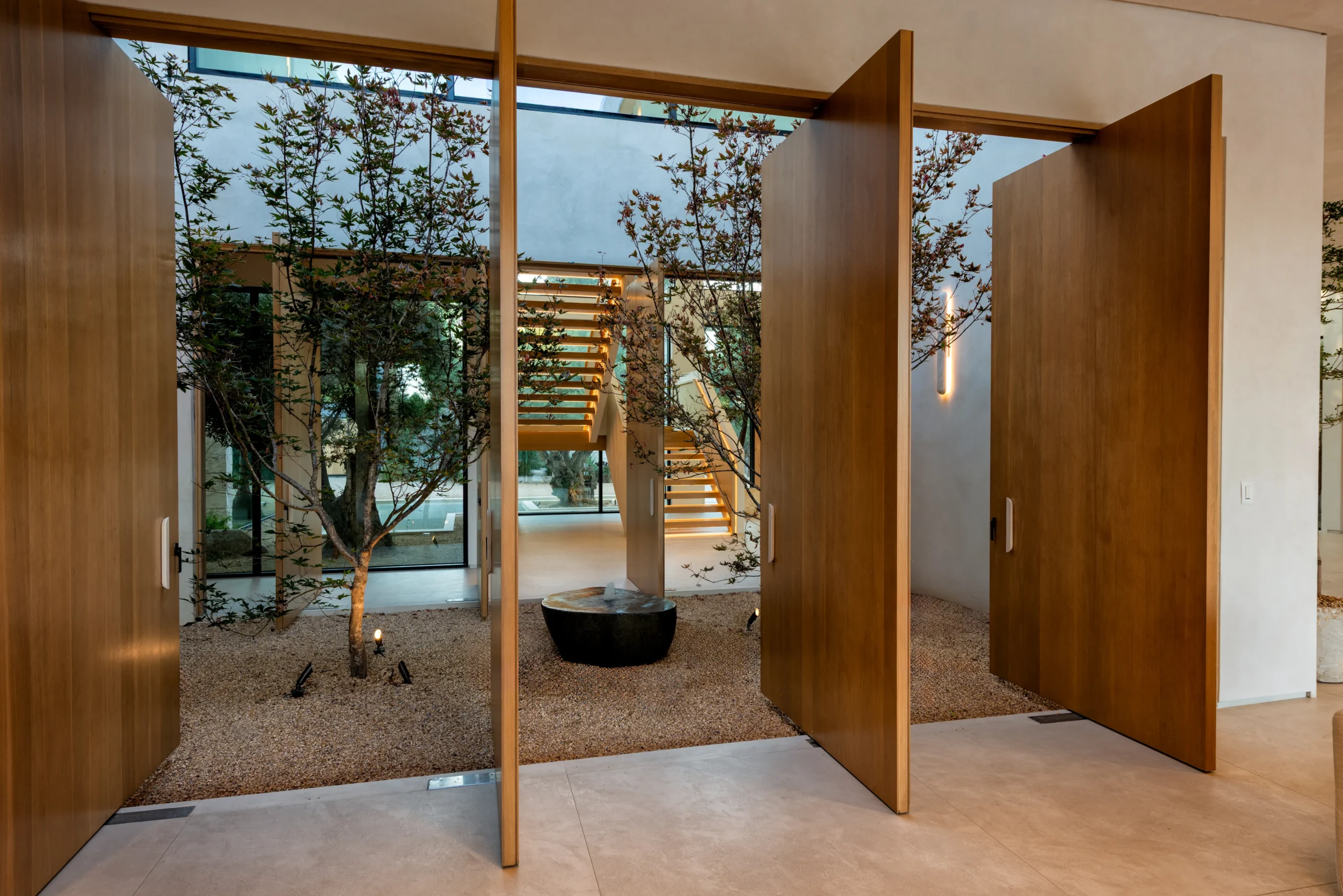 The front yard of this home gives a glimpse of things to come. There are two water features flanking the driveway, ancient olive trees, and a large arch made with Jerusalem stone. The scale and organic modern style create a sense of tranquility — and it sets the tone for the entire property.