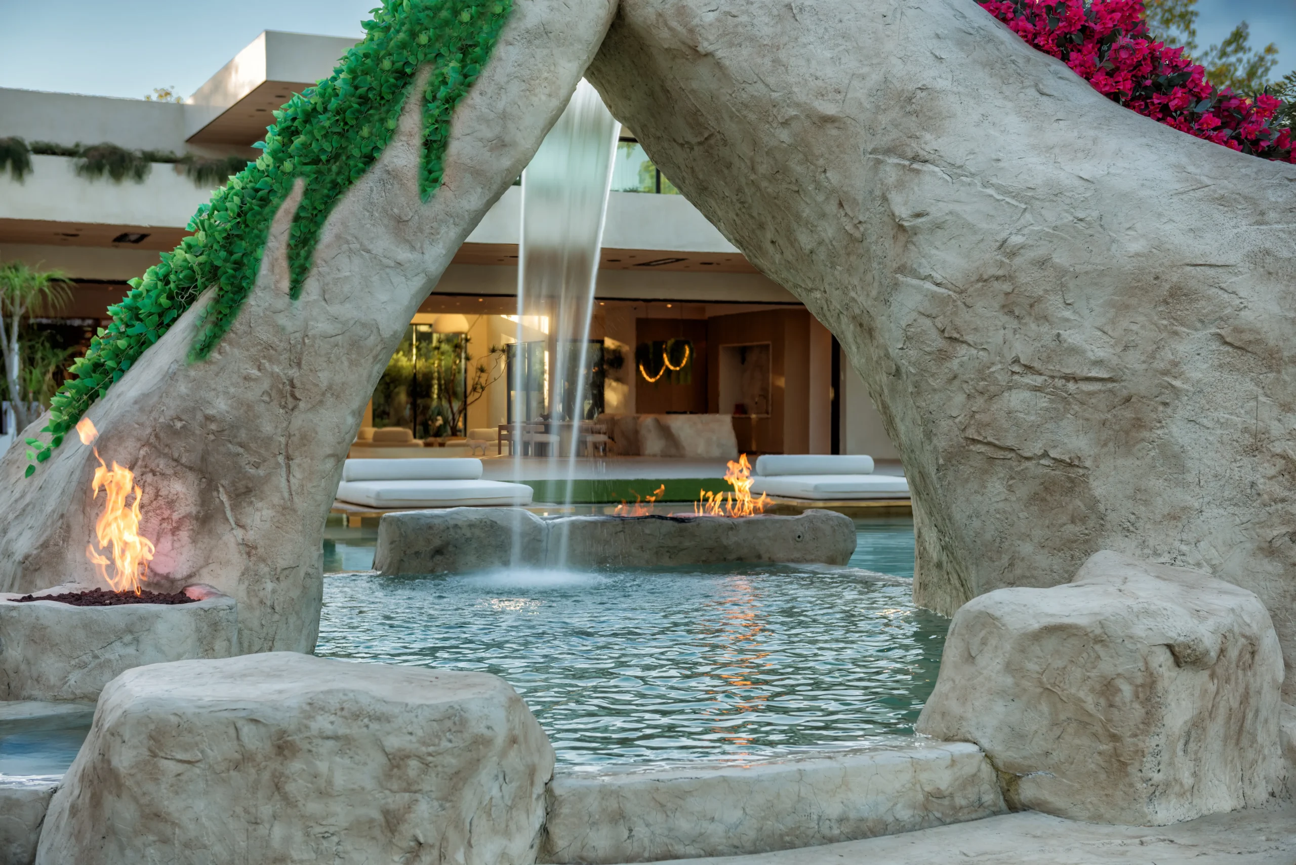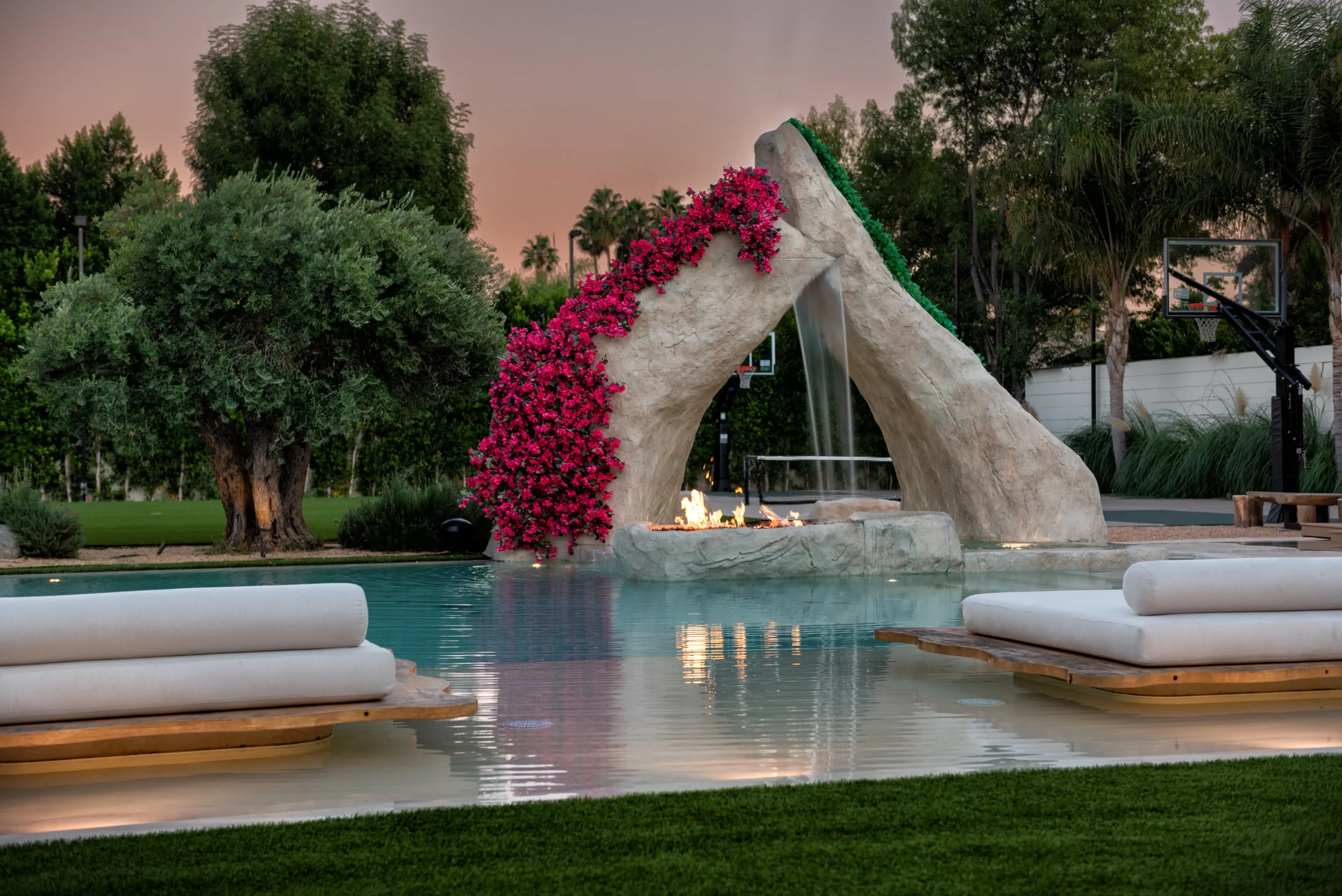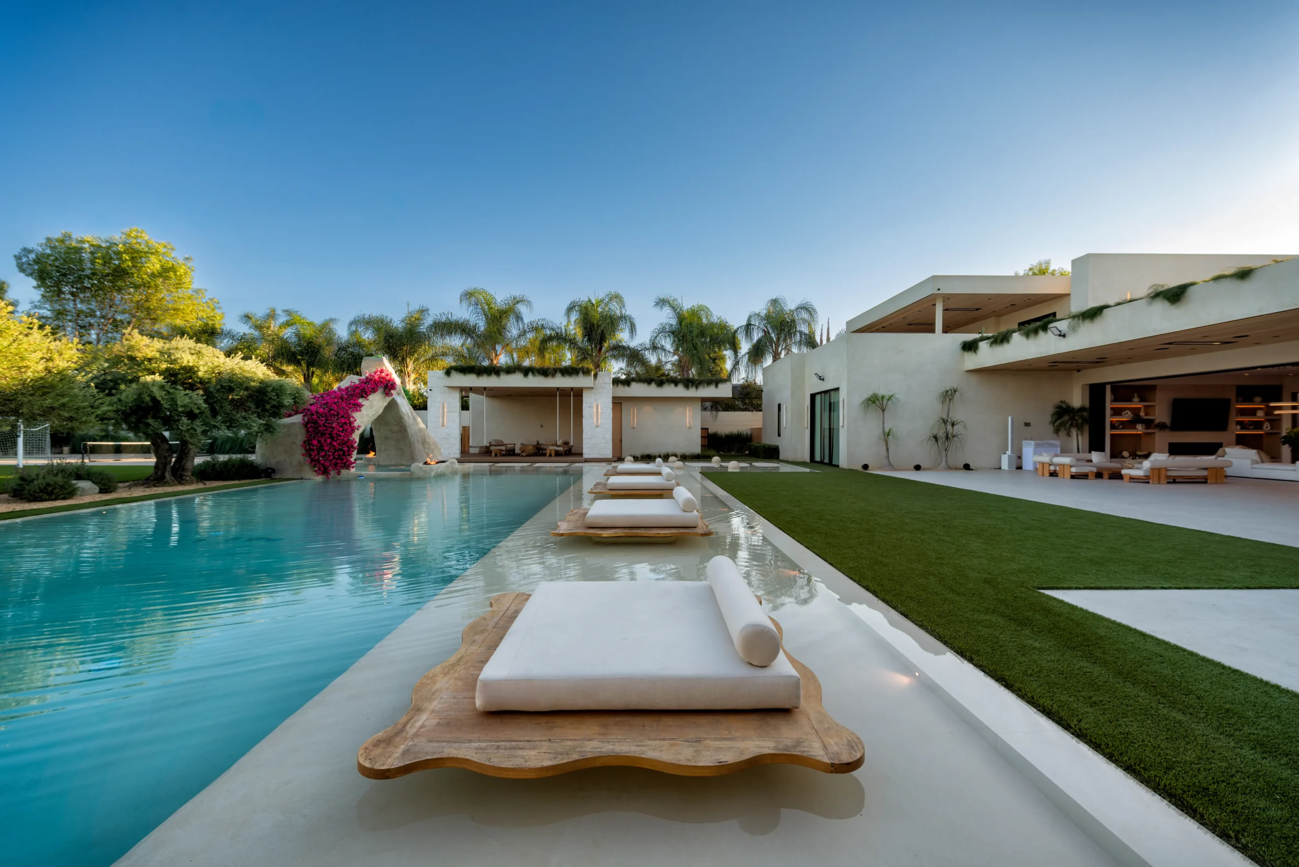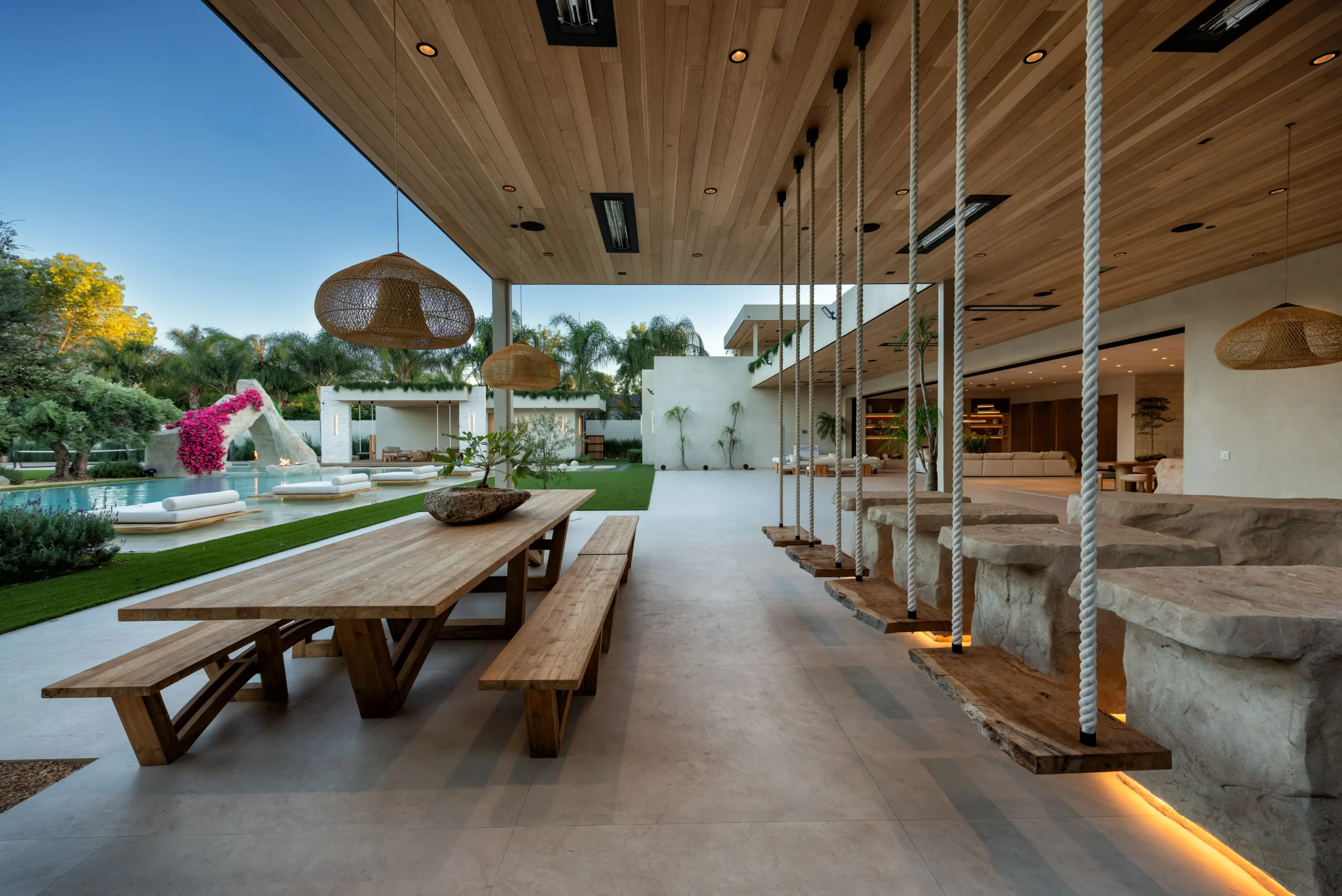 From a sunken seating area and floating daybeds to oversized stone boulders with water features, swings at the bar, and even a full pickleball and soccer court, every detail was designed to elevate outdoor living.