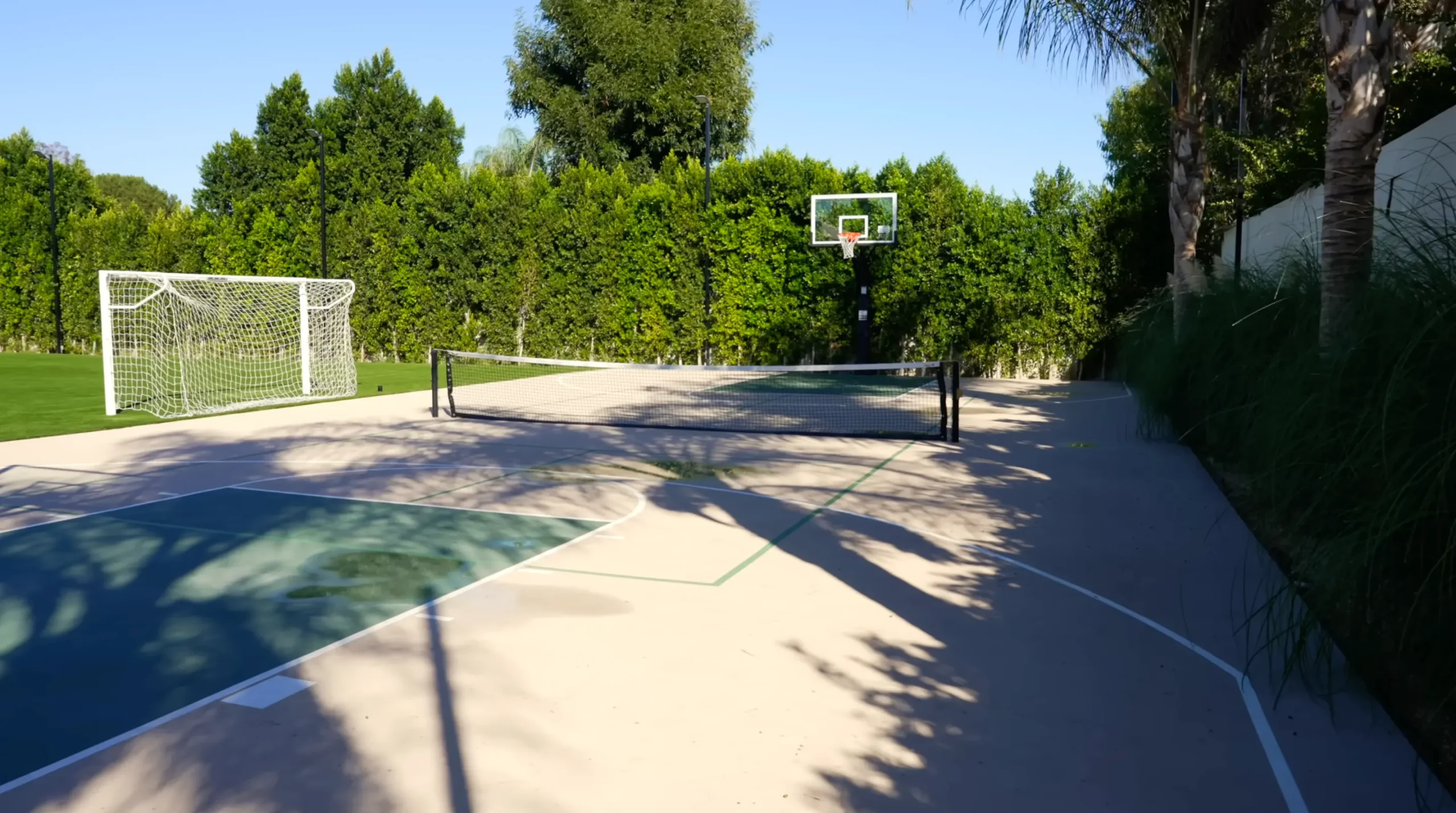 A: The yard includes a full-scale pickleball court / basketball court and a full-scale soccer field, plus an expanse of green that makes the property feel like a private park.