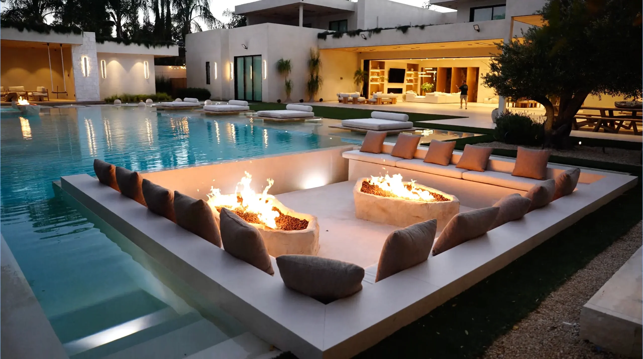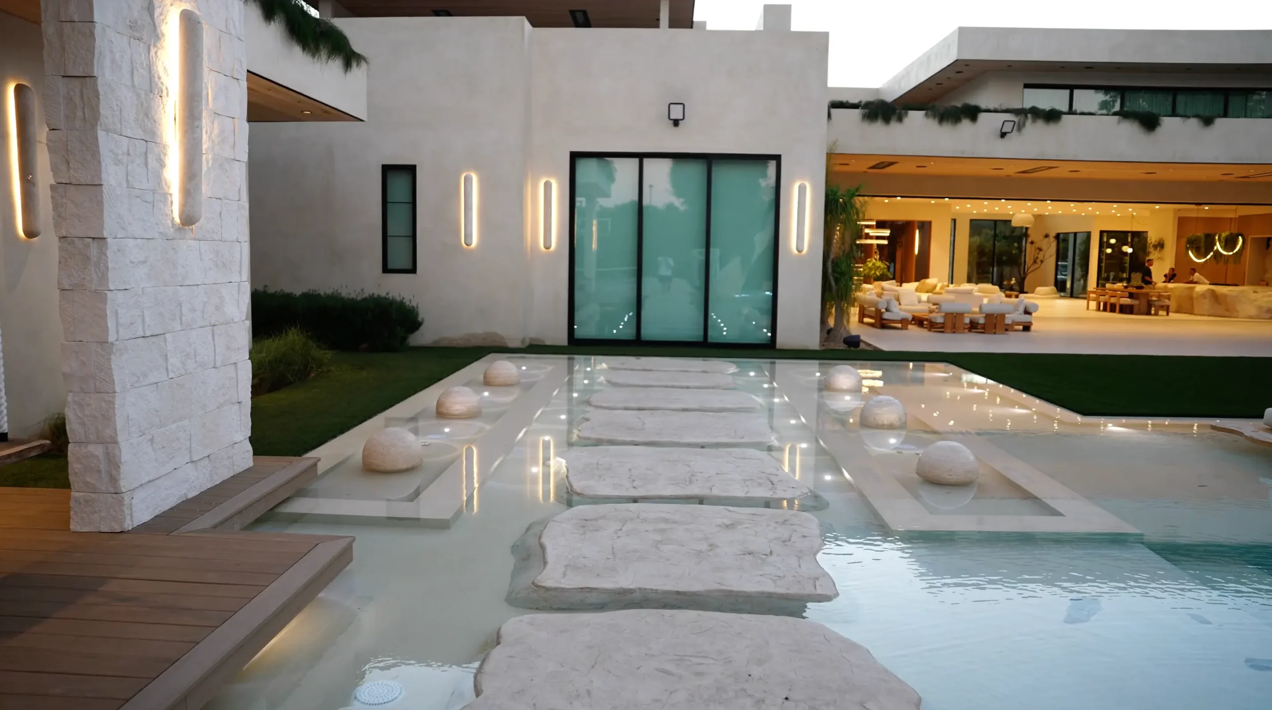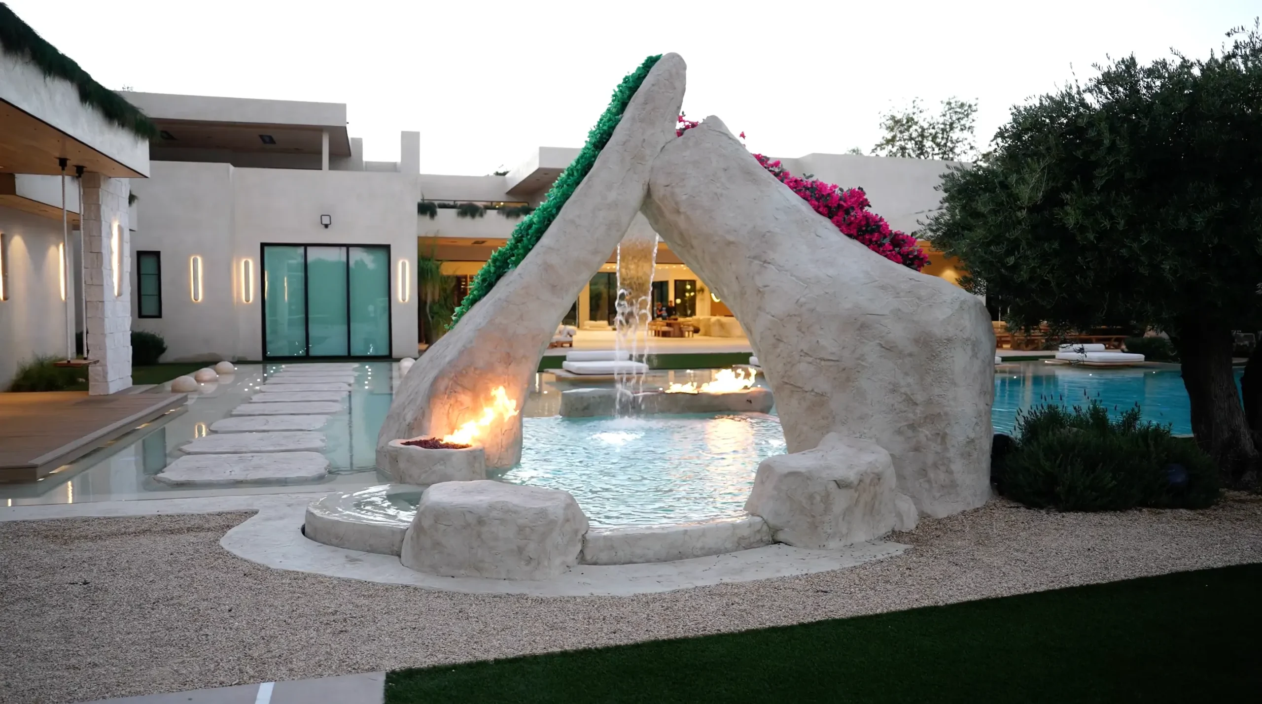 Water wraps around the entire space, creating movement and reflection everywhere you look. The walkways are designed to look like boulders emerging from the water, leading you through the yard in a way that feels sculptural and natural at the same time. This isn’t just a yard. It is an experience.