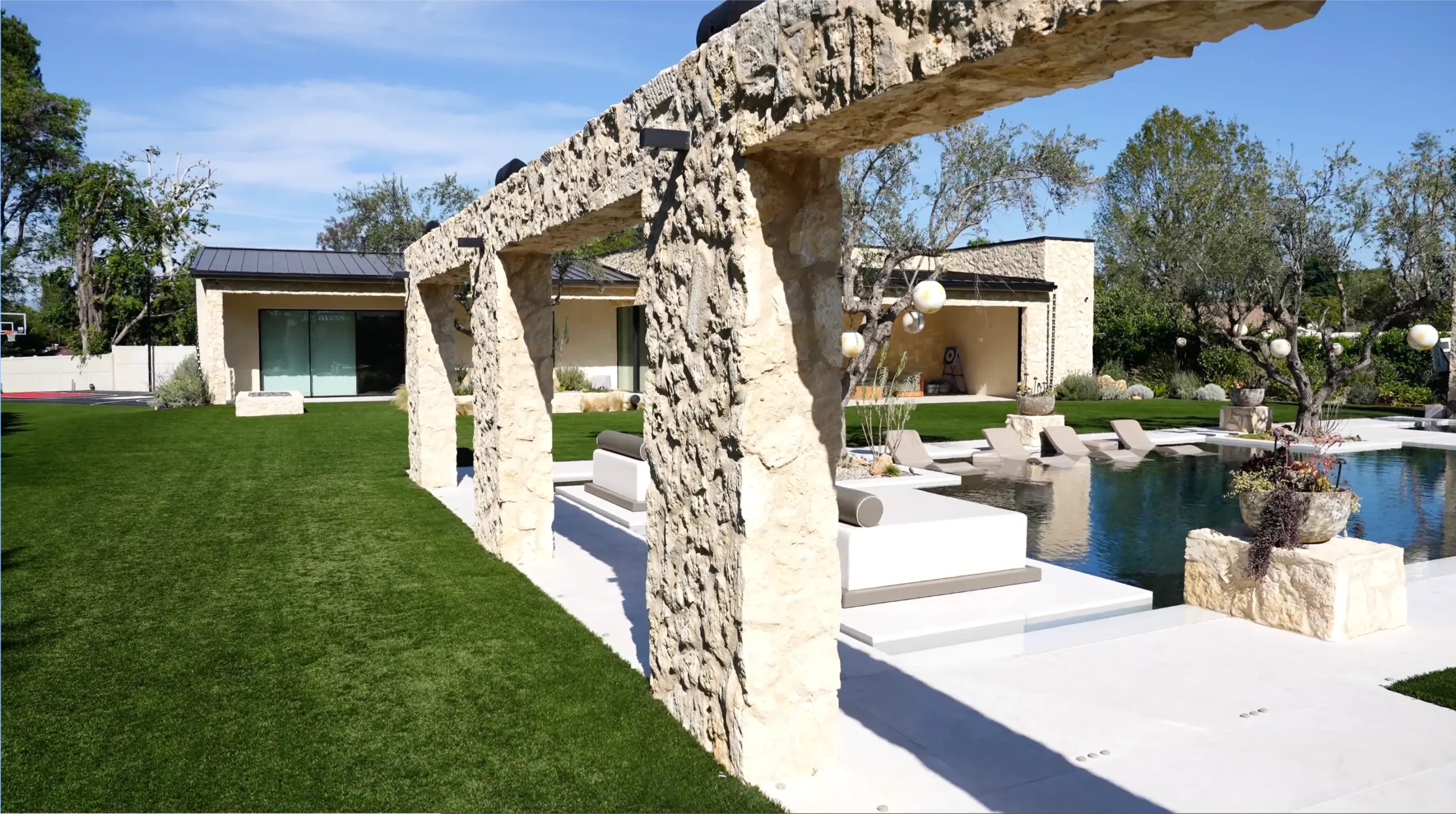 This started as a large, awkward lot with a multi-wing home and no clear center. But the final design connects the entire outdoor space with multiple areas for this growing family to spend time together.