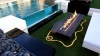 Get lost in the art of design from inside the spa. While inside you can peer through the large glass wall of the pool to see the welcoming firepit. Take in the creativity of the stone design among the turf around you, then gaze up and watch the sunset behind two glorious date palm trees.